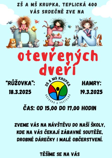 Minulý týden proběhly na obou našich budovách Dny otevřených dveří spojení s tradicí pohádkového světa, soutěžemi a dobrotami na závěr. Kolegyně převlečené za pohádkové postavy provázeli příchozí děti a jejich rodiče připravenými aktivitami. Za splnění dostali razítko...