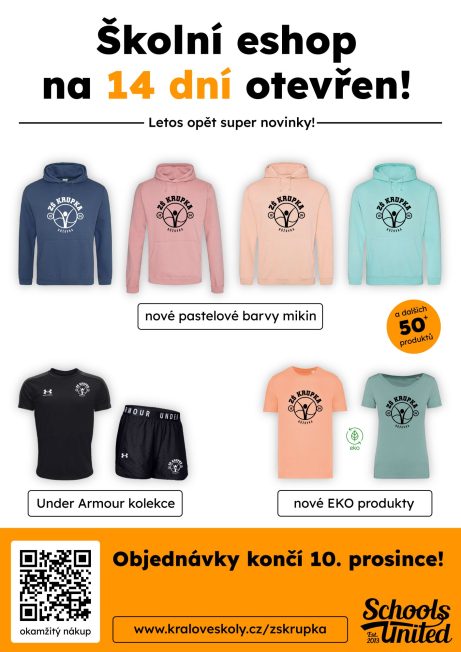 Dobrý den všem, a je to tady. Rád bych Vám touto cestou představil jednu skvělou novinku! Nechali jsme si jako škola vytvořit vlastní volnočasovou školní kolekci oblečení s motivem,...