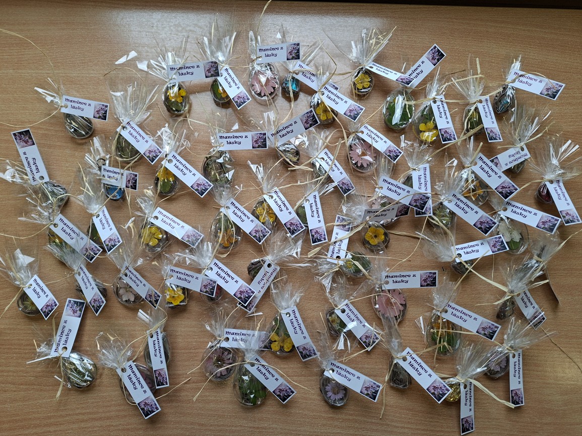 Pustili jsme se do výroby originálních přívěsků na krk, kdy jsme do pryskyřice zalili nasušené kvítky dostupných kytiček, které jsme nasbírali na zahrádce, a tak jsme si i mohli zopakovat, jak se všechny jmenují… Rozrazil rezekvítek, sedmikráska, květy jahodníku nebo jabloně aj.