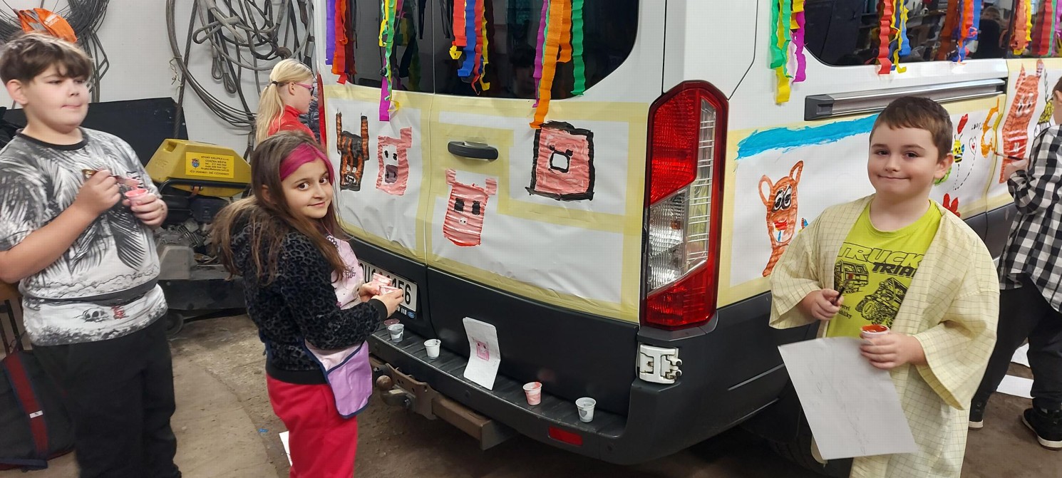 Žáci těchto tříd měli možnost ozdobit svými kresbami dodávku, která během masopustního průvodu jezdila po našem městě. Chopili se tedy štětců a barev a zadaný úkol plnili s nadšením. Výsledek byl toho důkazem.