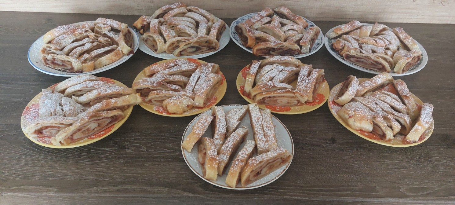 Pečeme vždy ráno (v ranní družině), abychom to mohli odpoledne zbaštit. A tak už ráno před půl šestou přicházely děti, které se velmi rády zapojují do našich aktivit kolem pečení. Nejdříve jsme museli jablíčka oloupat a nakrájet, aby se dala nastrouhat. Strouhání se chopil náš zkušený kuchtík Beník Šich, který za celou dobu nepůjčil struhadlo z ruky a já nestíhala podávat oloupaná jablíčka, jak rychle pracoval. Tímto mu děkuji za jeho nasazení a píli. Pak už přišel čas na balení štrůdlů a přidání všeho, co dělá štrůdl štrůdlem. Tam se nám již zapojilo více dětí a moc je to všechny bavilo…