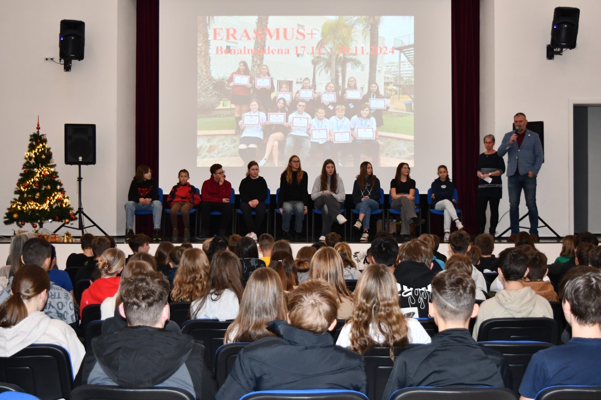 Třináct žáků naší školy, kteří se zúčastnili podzimního studijního pobytu v mezinárodní škole ve Španělské Benalmádeně,