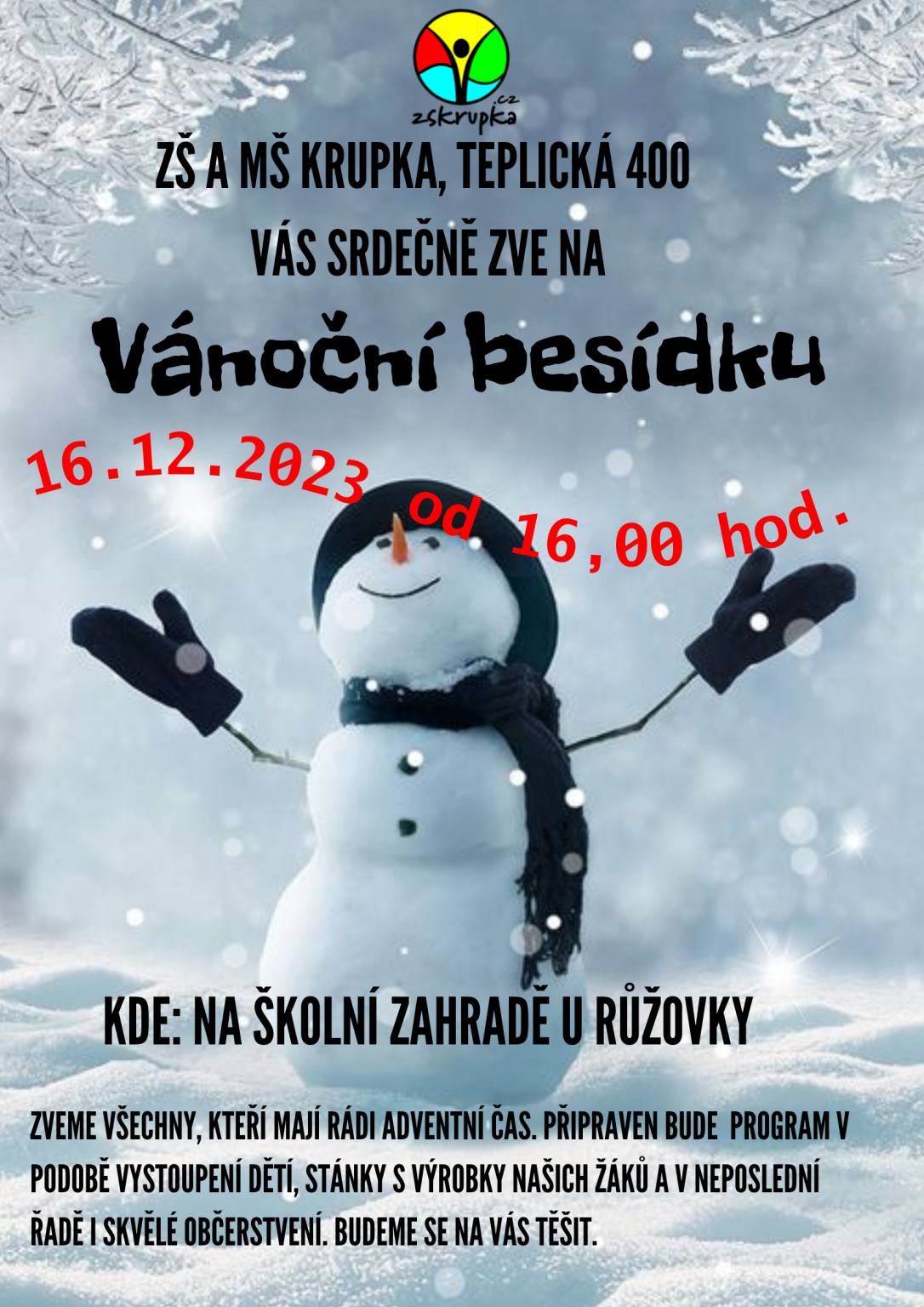 Zveme všechny, kteří mají rádi adventní čas na Vánoční besídku, kterou dne 16.12.2023 od 16,00 hodin pořádá školní družina naší školy.